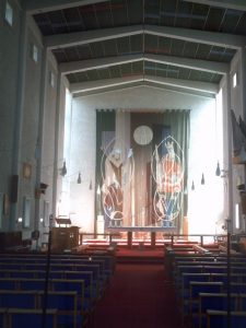 They were the first parish churches which Spence built in England and were completed in 1957, five years before Coventry was consecrated. Gerald Holtom did the wall hanging behind the alter depicting St. Oswald and St. Aidan (see photograph on left).
