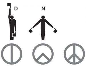Other sources say its design incorporates a circle with the lines within it representing the simplified positions of two semaphore letters (the system of using flags to send information great distances, such as from ship to ship). The letters “N” and “D” were used to represent “nuclear disarmament.” The image of the right shows the “N” is formed by a person holding a flag in each hand and then pointing them toward the ground at a 45 degree angle. The “D” is formed by holding one flag straight down and one straight up. But Holtom was never in any armed forces so how would he know this flag code? And we’re is the “C”?